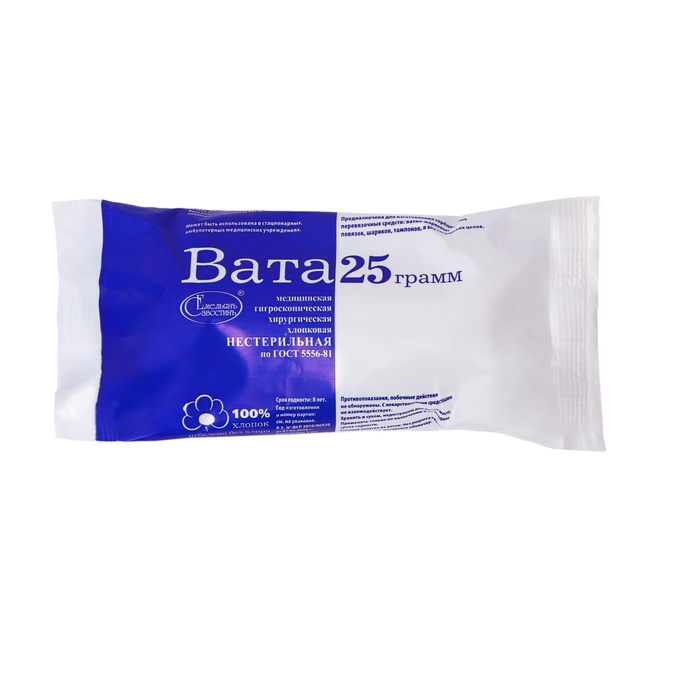 Вата медицинская хирургическая нестерильная используется в медицинских и гигиенических целях, производится из натурального длинноволокнистого сырья (волокна 100% хлопка высшей пробы) без добавления добавок и примесей. Вата хирургическая имеет высокую степень прочеса - что обеспечивает отсутствие сорных примесей и включений, по своей структуре легко распределяется на параллельные слои. Обладает высокой сорбционной способностью (эффективно впитывает и удерживает влагу). Вата медицинская хирургическая имеет идеально белый цвет и не содержит посторонних запахов. Отбеливание ваты производится в соответствии требованиям ГОСТа 5556-81 (без использования хлора и его компонентов).